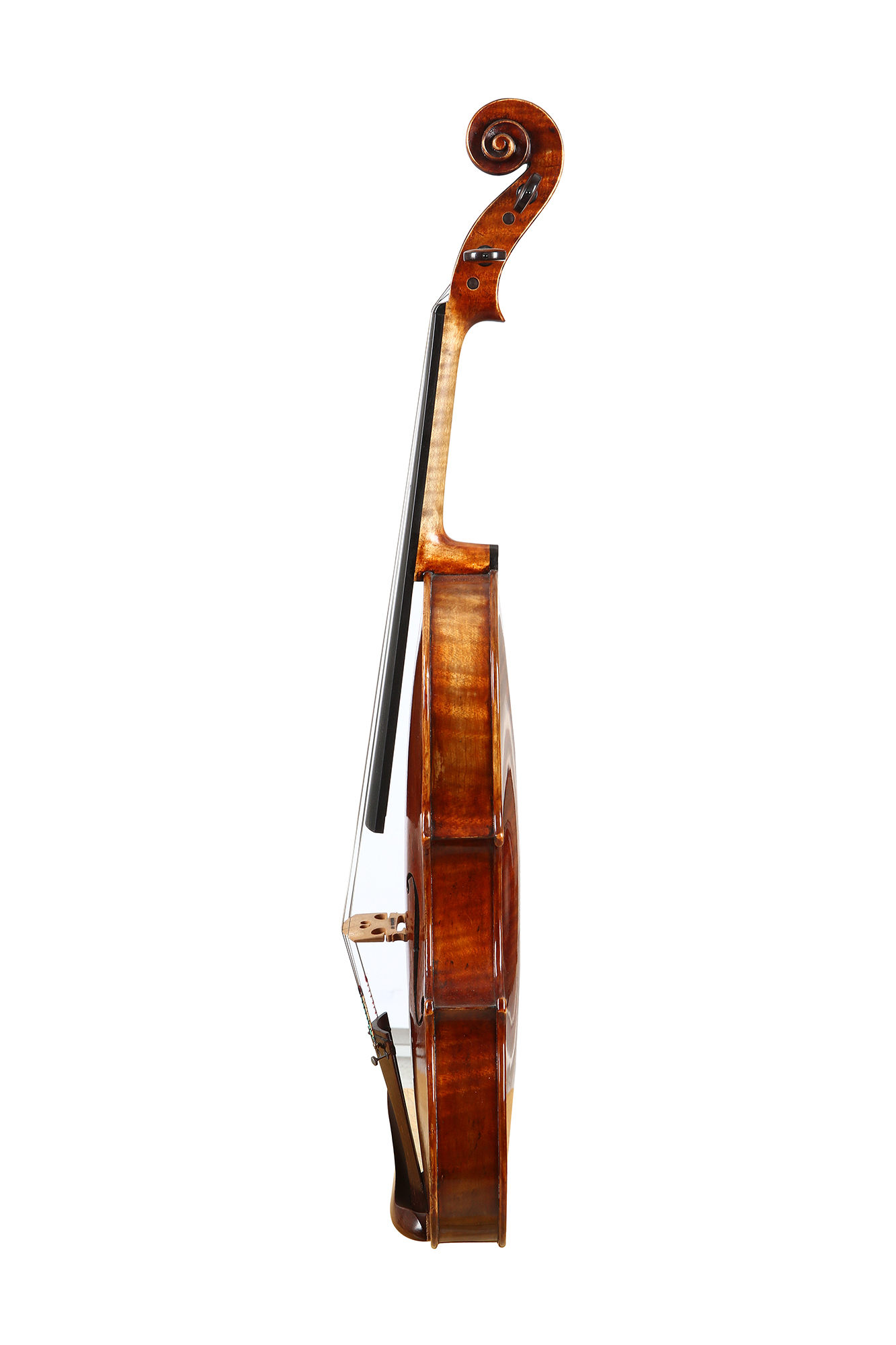 이 작품은 과다니니의 마지막 비올라에서 영감을 받아 이를 모델로 삼아 제작되었습니다. 과다니니가 생애 말기에 이르러 기존의 제작 스타일에서 벗어나 자신만의 독창적인 스타일을 모색했던 것처럼, 본 제작자 역시 평소에 주로 사용하던 오일 바니시에서 벗어나 새로운 코팅 방식과 알코올 바니시를 시도하며, 안틱 스타일로 악기를 완성하였습니다.