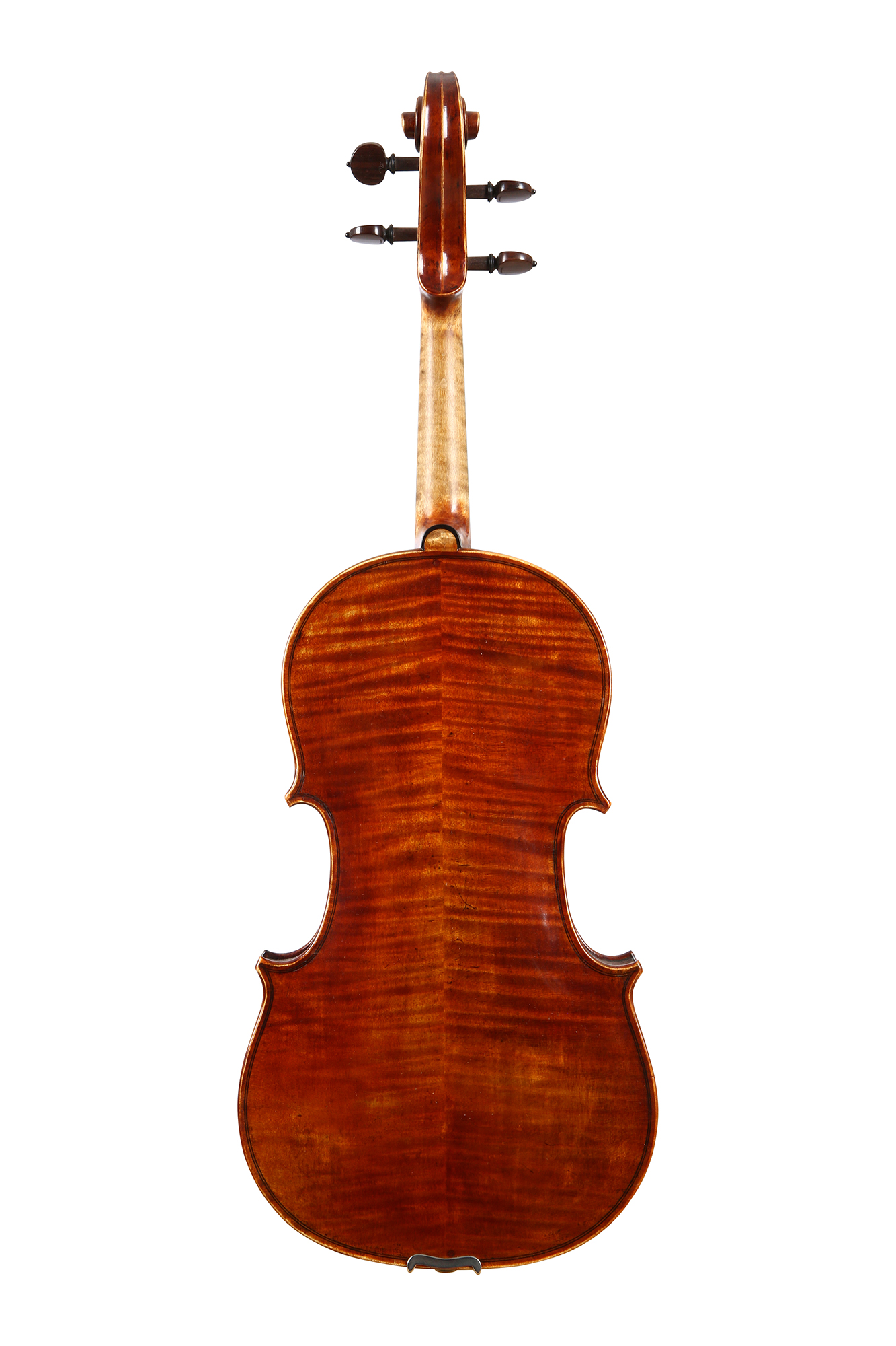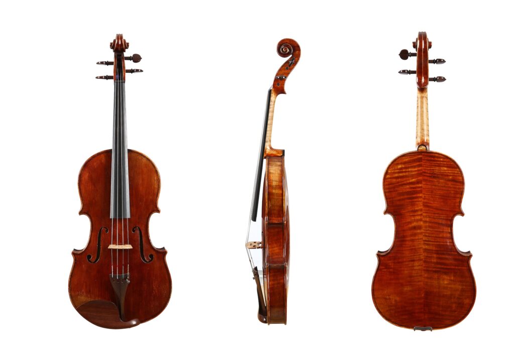 특히 주목할 점은, 전통적인 크레모나 스타일의 바니시가 사용되지 않았다는 점입니다. 악기의 아칭(arch)은 매우 넓고 평평하며, f홀 또한 크고 넉넉한 간격으로 배치되어 있는 것이 특징입니다.